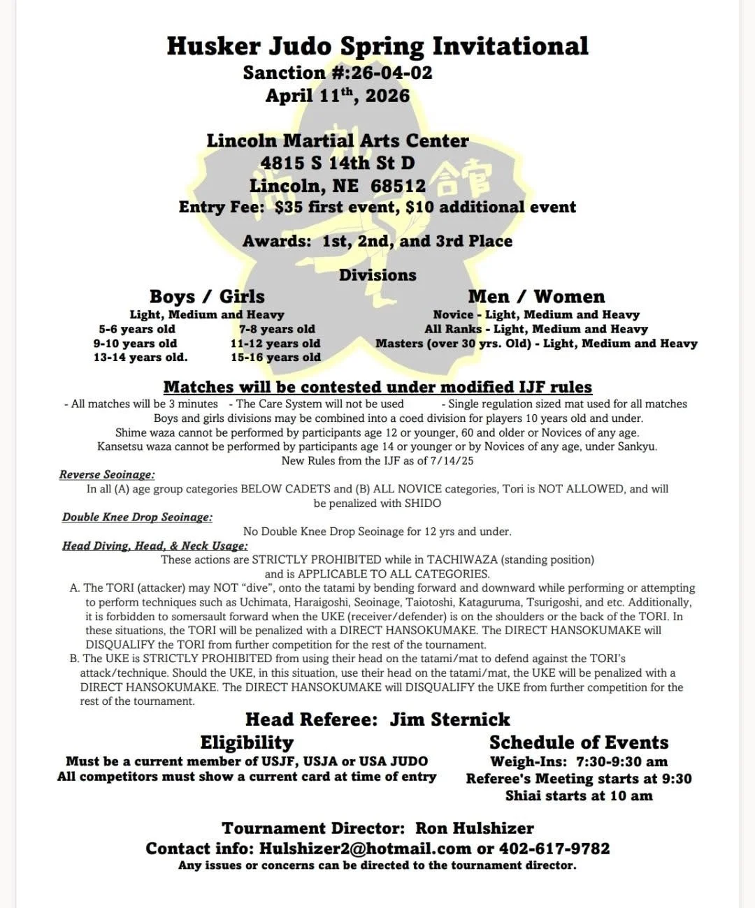 Husker Judo Spring Invitational Saturday, April 11, 2026 8:00 AM 3:00 PM Lincoln Martial Arts Center 4815 South 14th Street Lincoln, NE, 68512 United States (map) Google Calendar ICS